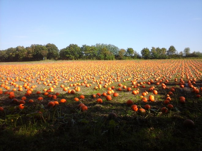 Foto Jochen Geis Blick aus dem dunklen Wald auf ein goldgelbes herbstliches Kürbisfeld, Brühl Seenwanderung